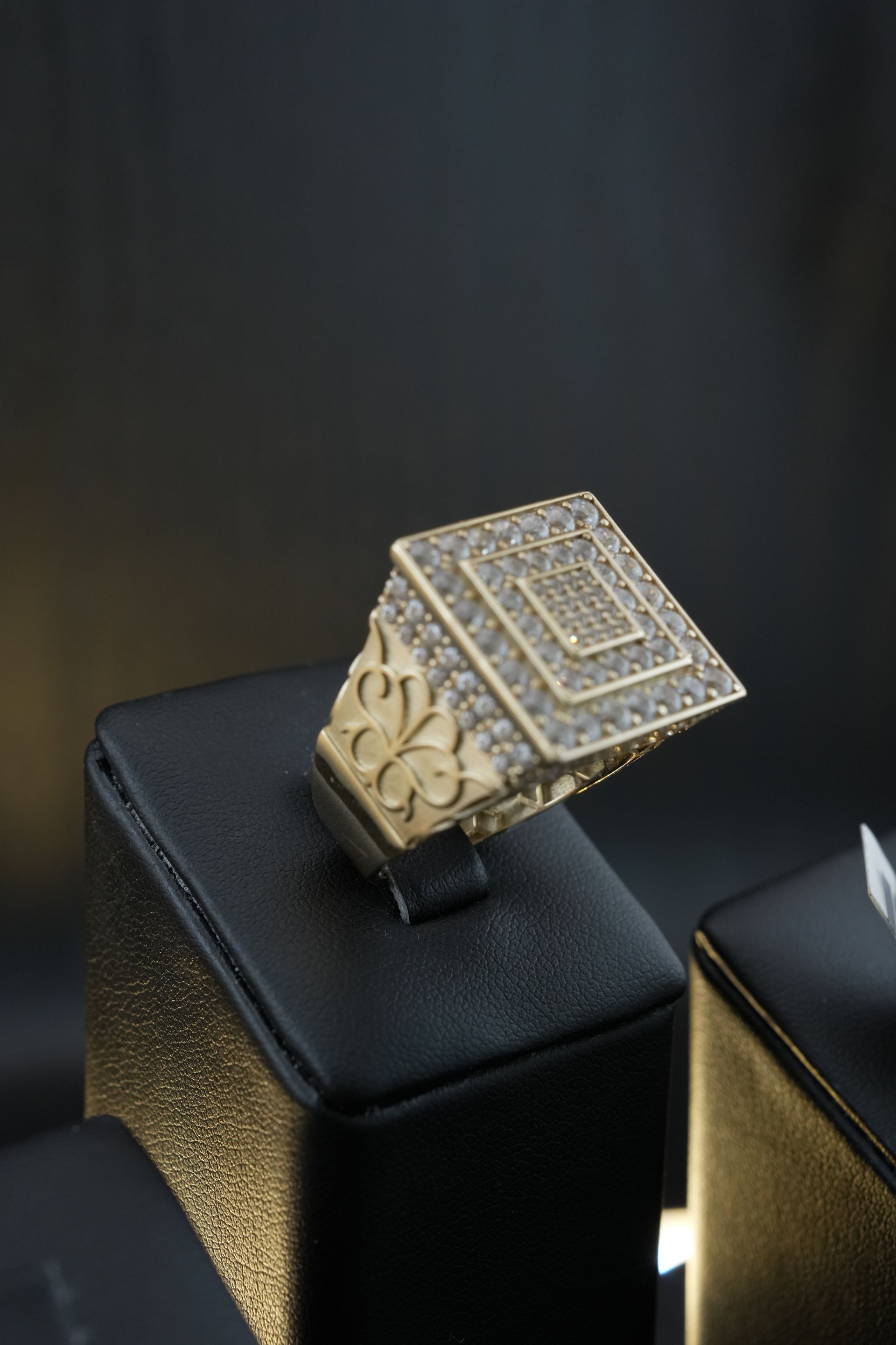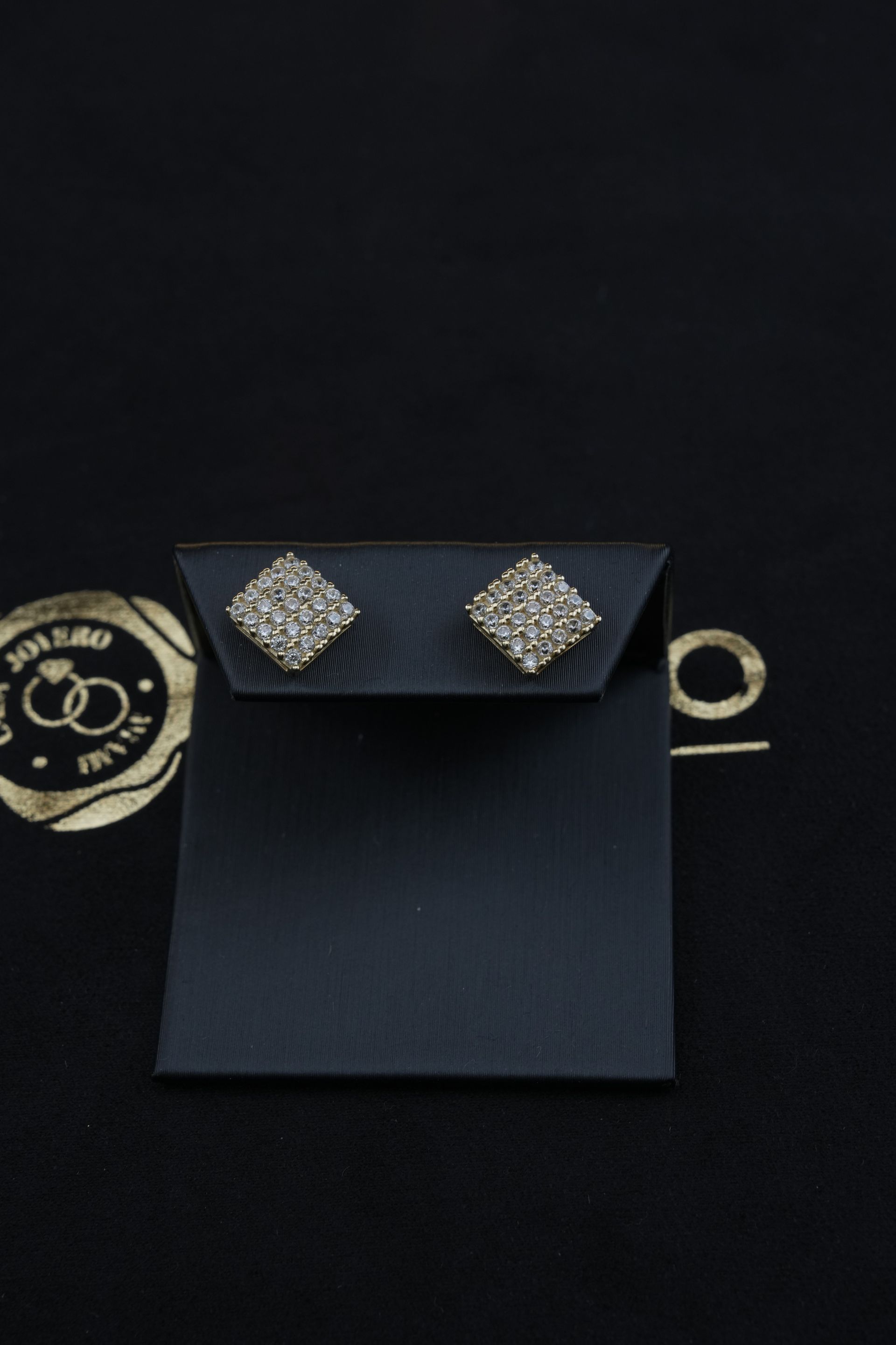 Anillo cuadrado en oro amarillo con incrustaciones de cristales brillantes, que ofrece un toque de lujo y distinción para cualquier ocasión especial.